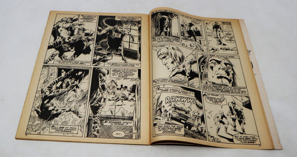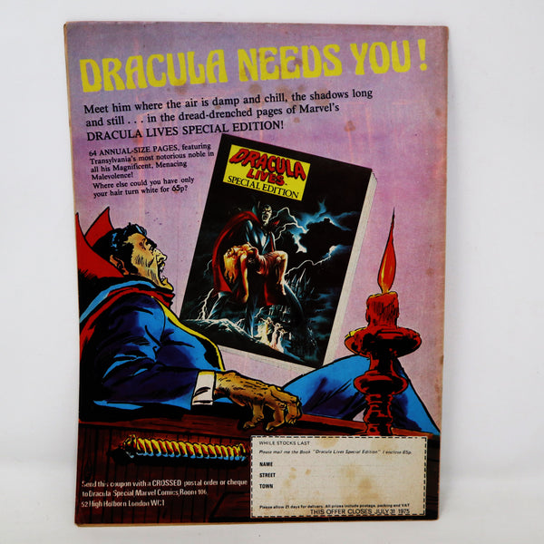 Dracula Lives is in good condition considering its age with a little nick/tear on the back cover, a 1cm tear in the top of the spine on the cover, some creasing, corner/edge wear and discolouration/marks/stains. It makes a nice Collector's piece, displays nicely and is a must for any Dracula or Marvel fan.