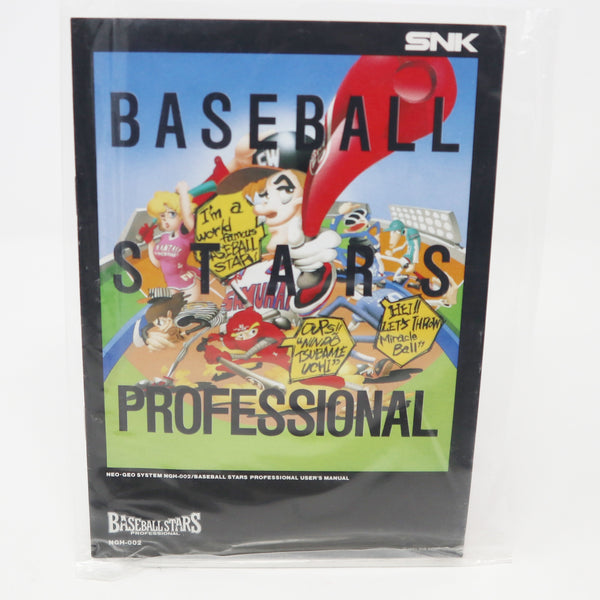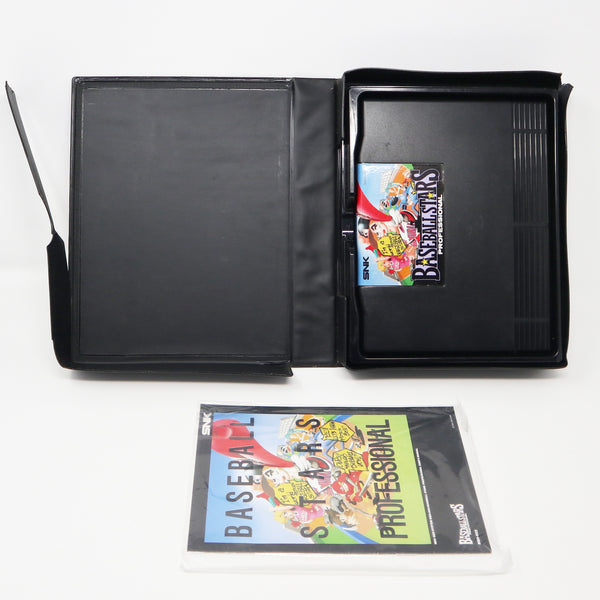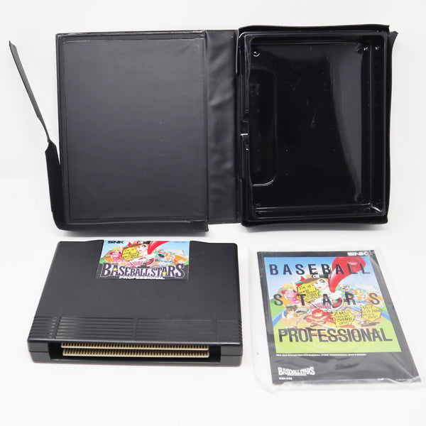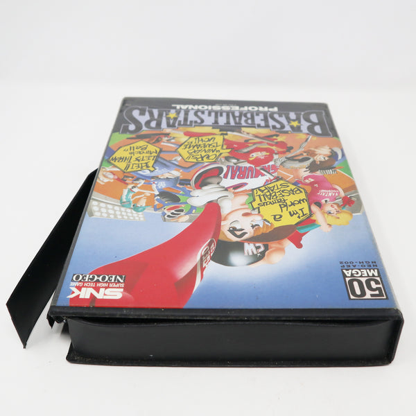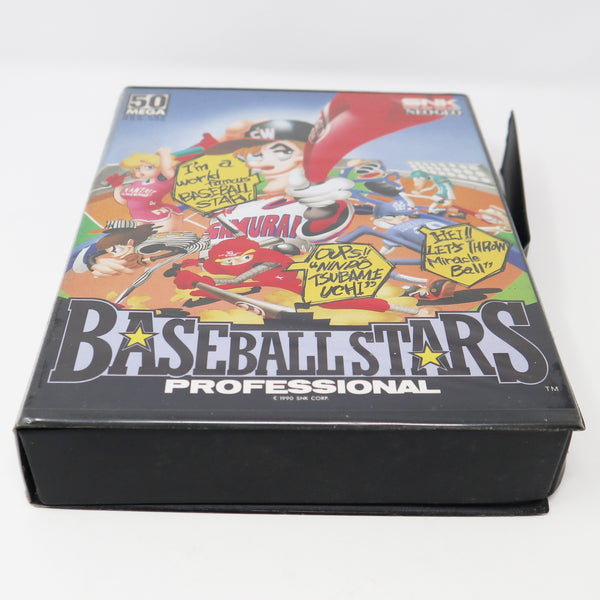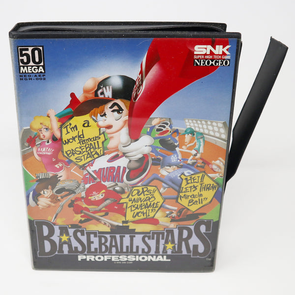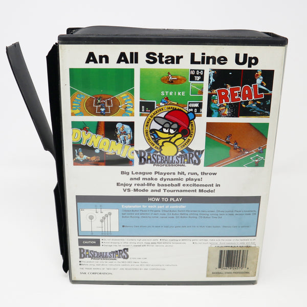 Baseball Stars Professional is a great vintage video game and is in good working condition with some light surface scratches and scuffs, plus a missing top edge and tears in the front/seam/back of the outer case, as shown. The inner tray also has some splits and pieces missing. These are common faults. The game cartridge has been tested on a Neo-Geo AES Console and is fully working. The case is printed with '1990 SNK Corp.' on the front. The User's Manual is also included and is in good shape. Baseball Stars Professional displays nicely and is a must for any retro gaming fan.