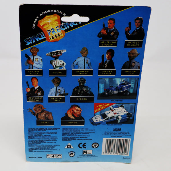 Lieutenant Brogan comes mint and sealed on his original card with his accessories. The figure stands at just over 3.5" tall. The card is in good condition considering its age with slight creasing/bending, corner/edge wear and scuffs, as shown. The bubble is also in good condition considering its age and the glue has dried out in places, with some light surface scratches/scuffs. Card is printed with 'Vivid Imaginations Ltd.', '1994 The Space Precinct Limited Partnership' and 'Made in China'. Suitable for ages 4+. Lieutenant Brogan displays nicely and is a must for any Space Precinct or Gerry Anderson fan.