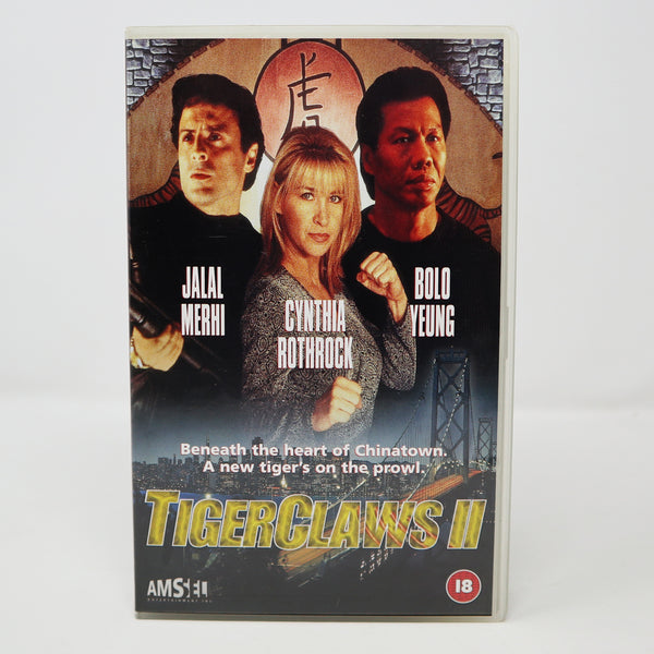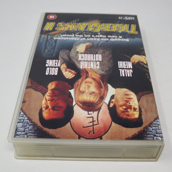 Tiger Claws II comes complete and in good condition considering its age with slight wear and includes its original Case (which has a little split to the plastic along the seam) and Tape, as shown. The Tape has a Blockbuster Video sticker on it, making it a rare Ex-Rental version. The back cover is printed with '1999 Sterling Home Entertainment'. This VHS displays nicely and is a must for any Jahal Merhi / Cynthia Rothrock / Bolo Yeung fan.