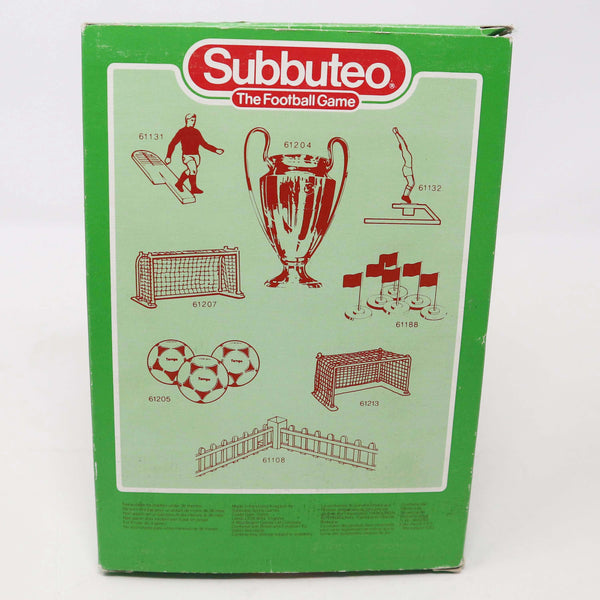 The box has some wear with little tears where some of the flaps meet the box, creasing, corner/edge wear, surface scuffs/scratches, a sticker and marks, as shown. The plastic window has come away from the box at one side with some light surface scratches/scuffs/dints. The top and bottom flaps have been opened and all inner flaps remain. The box is printed with 'Made in the United Kingdom by Subbuteo Sports Games' and 'A Waddingtons Games Ltd. Company'.