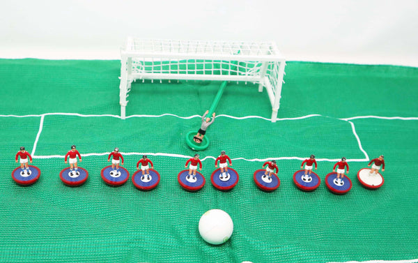 The Contents consist of: 2 Teams (please note 1 player is missing and all are different red/blue teams), 2 Goals, 2 Footballs and Playing Cloth. Please note that 2 Line Flags are broken off at the bottom. We're not sure whether anything else apart from the Rules Leaflet and 1 player are missing. The players and accessories have paint wear and the Playing Cloth has some bobbling/creasing which is common, but this doesn't detract from this nice vintage toy Set in any way.