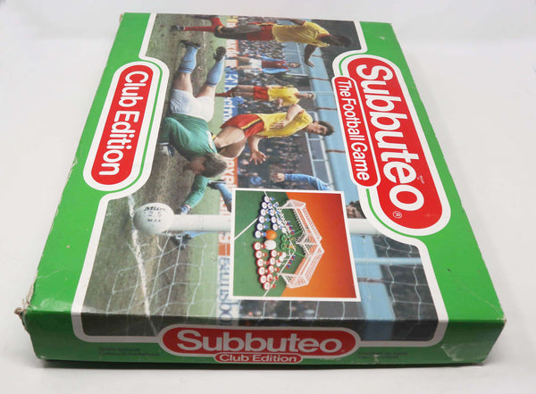 The box is in fair condition considering its age with sellotape used to repair tears along the corner seams of the top lid, some creasing, corner/edge wear and surface scuffs/stain marks, as shown. It opens up to reveal the pieces in their polystyrene tray. This has some chips and wear, but helps to protect the Game when not in use. The box is printed with 'Made in the United Kingdom by Subbuteo Sports Games Limited'. Subbuteo The Football Game Club Edition displays nicely and is a must for any Footy fan.