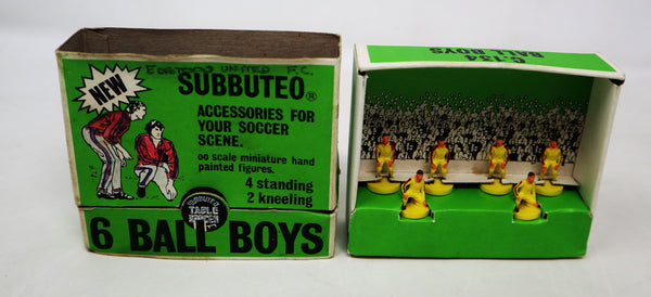 The boxes have some wear with creasing, corner/edge wear, plus surface scuffs/scratches/marks/stickers, plus writing on the 6 Ball Boys box, as shown. They are printed with 'Made in the United Kingdom by Subbuteo Sports Games'. Subbuteo Score Recorder, TV Tower, 6 Ball Boys and Plastic Fence Surround display nicely and are a must for any Footy fan.